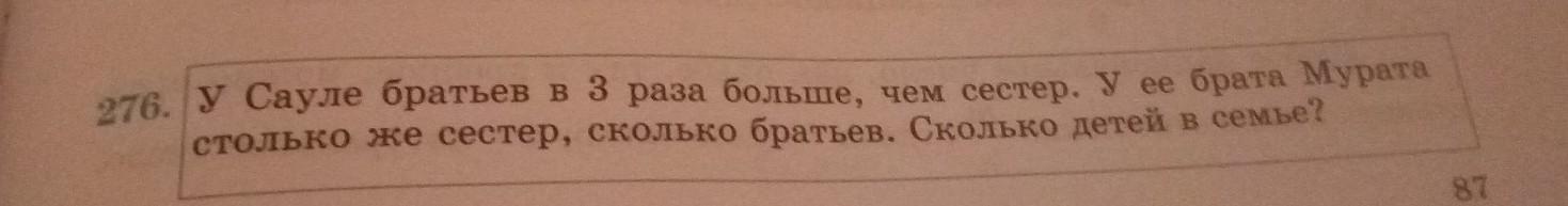 276. У Сауле братьев в 3 раза больше, чем сестёр. У ее брата Мурата столько же сестёр, сколько братьев. Сколько детей в семье? ._. помогите ._.
