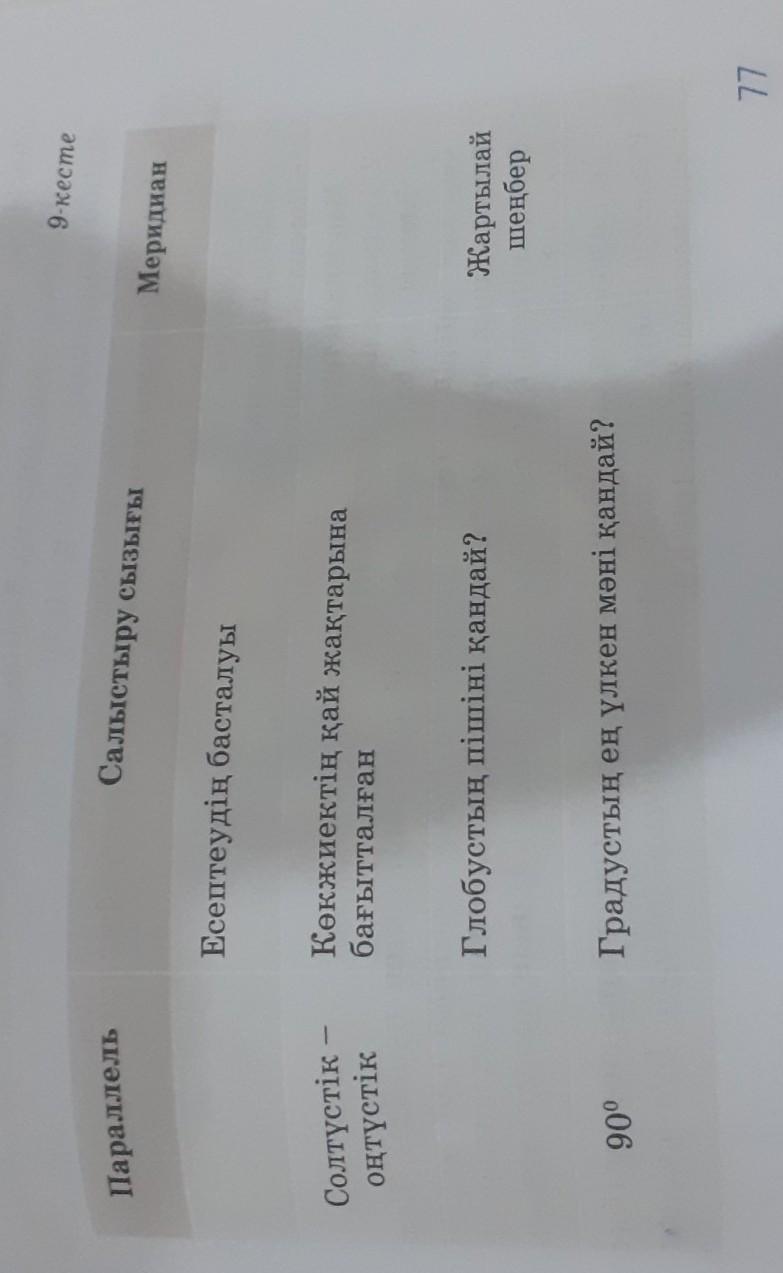 9-кесте Параллель Салыстыру сызығы Меридиан Есептеудің басталуы Солтүстік – оңтүстік Көкжиектің қай жақтарына бағытталған Глобустың пішіні қандай? Жартылай шеңбер 90° Градустың ең үлкен мәні қандай?