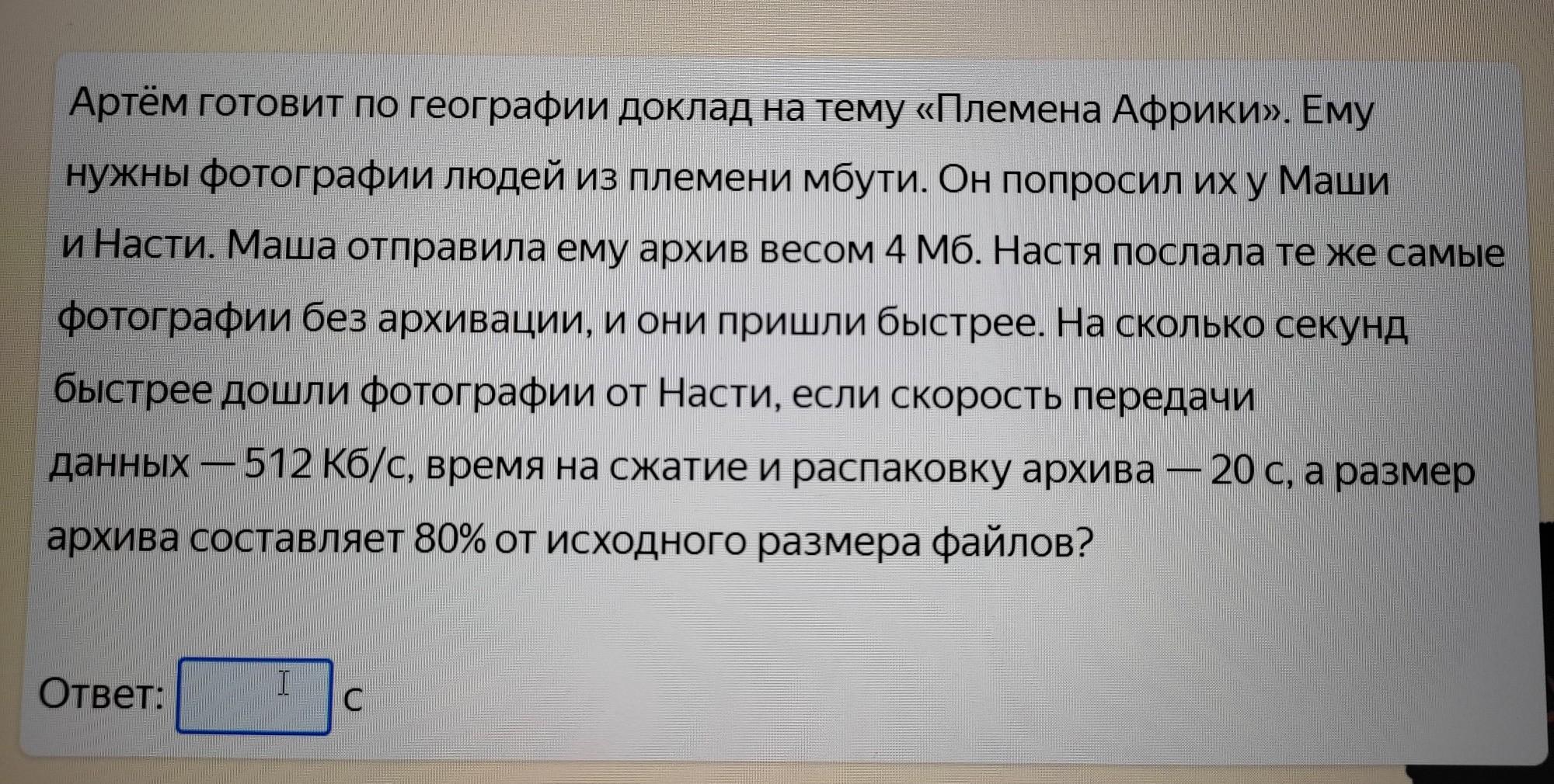 Артём готовит доклад по географии на тему «Племена Африки». Ему нужны фотографии людей из племени мбути. Он попросил их у подруг из параллельного класса — Маши и Насти. Маша отправила ему архив весом 4 Мб. Настя послала те же самые фотографии без архивации, и они пришли быстрее.