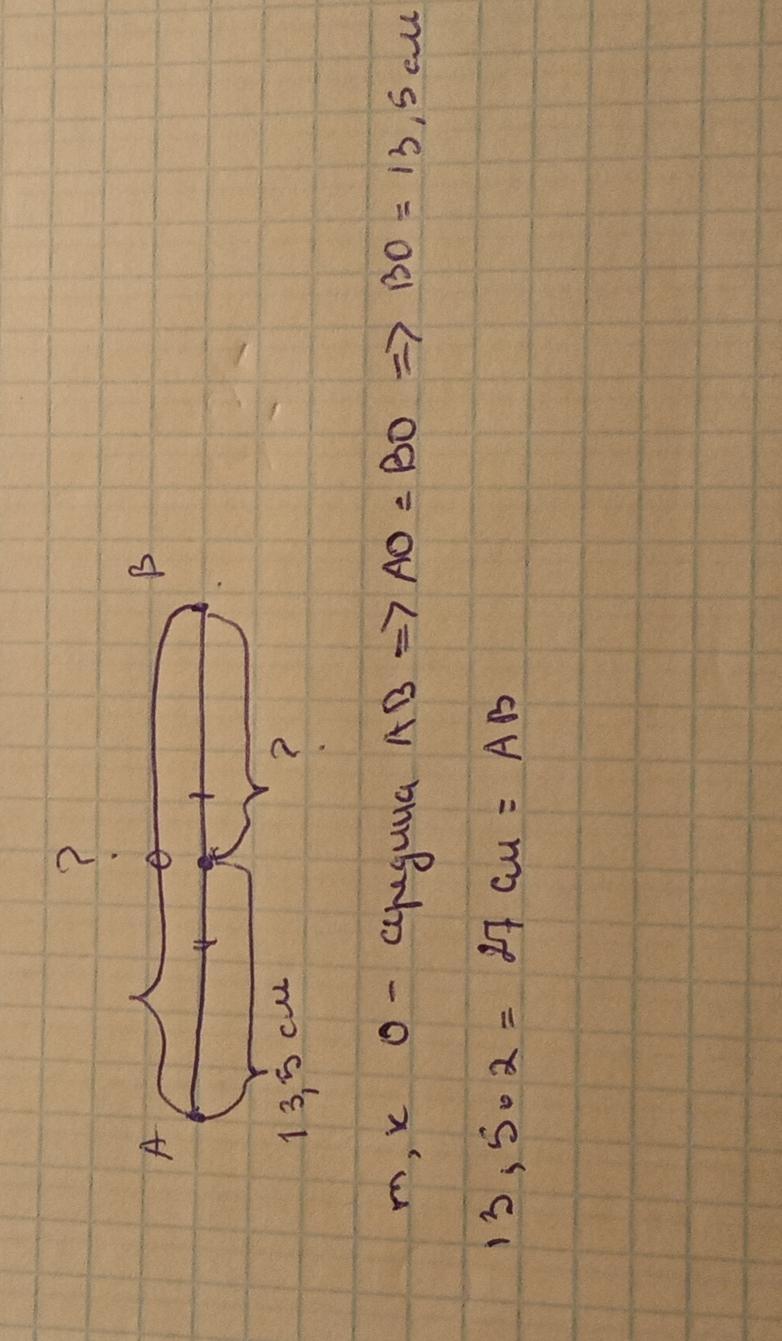 Точка О является серединой отрезка АВ. Отрезок ОА равен 13,5 см. Найдите длину отрезков ОВ, АВ.