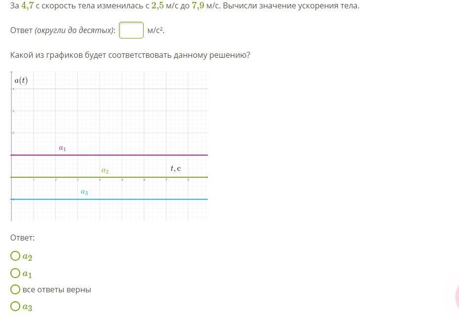 За 4,7 с скорость тела изменилась с 2,5 м/с до 7,9 м/с. Вычисли значение ускорения тела.