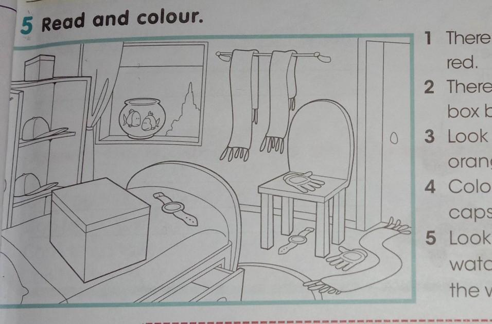 .1 Есть три шарфа. Раскрасьте их в красный цвет. 2 Есть две коробки. Раскрасьте большую коробку в синий цвет, а маленькую - в желтый. 3 Посмотри на рыбу! Раскрасьте ее в оранжевый цвет. 4 Раскрасьте перчатки в желтый цвет, а шапки/кепки - в красный. 5 Посмотрите на часы! Раскрасьте часы на кровати в оранжевый цвет. Раскрасьте часы под стулом в фиолетовый цвет.