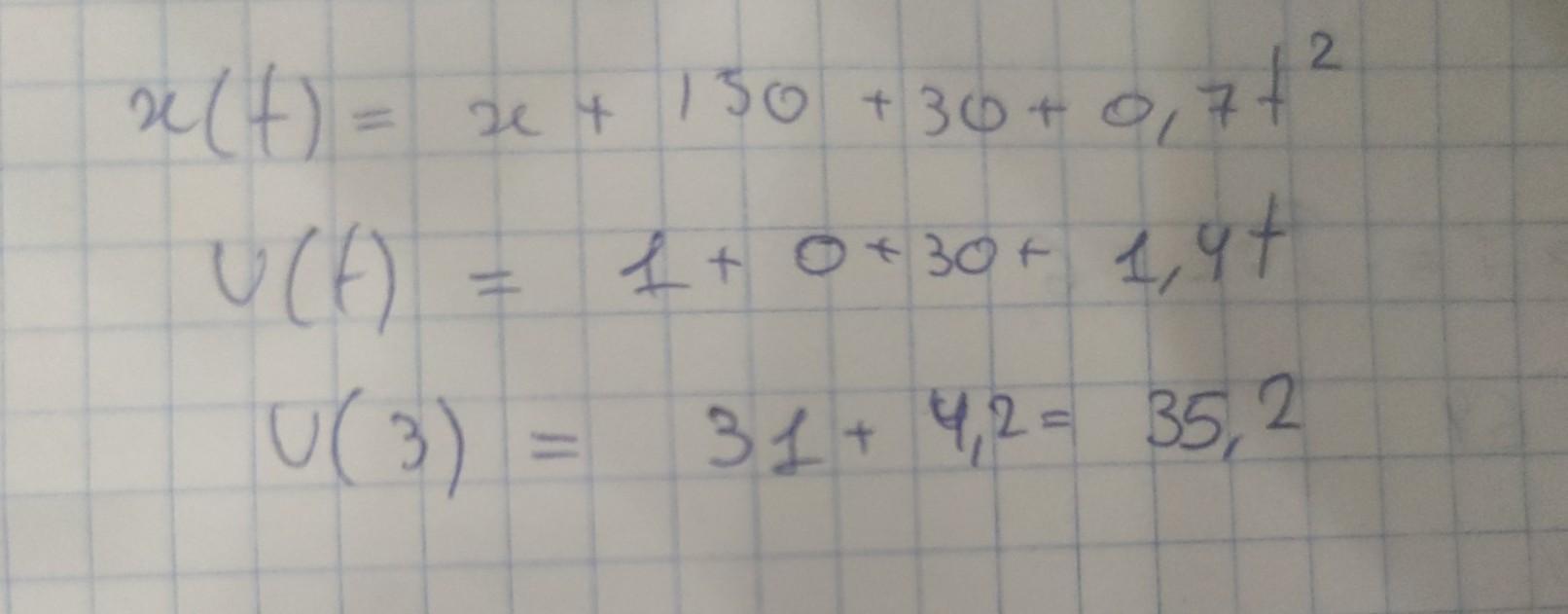 Движение легкового автомобиля задано уравнением: х+150+30t+0,7t^2 ,м. Чему равна скорость автомобиля через 3 секунды?