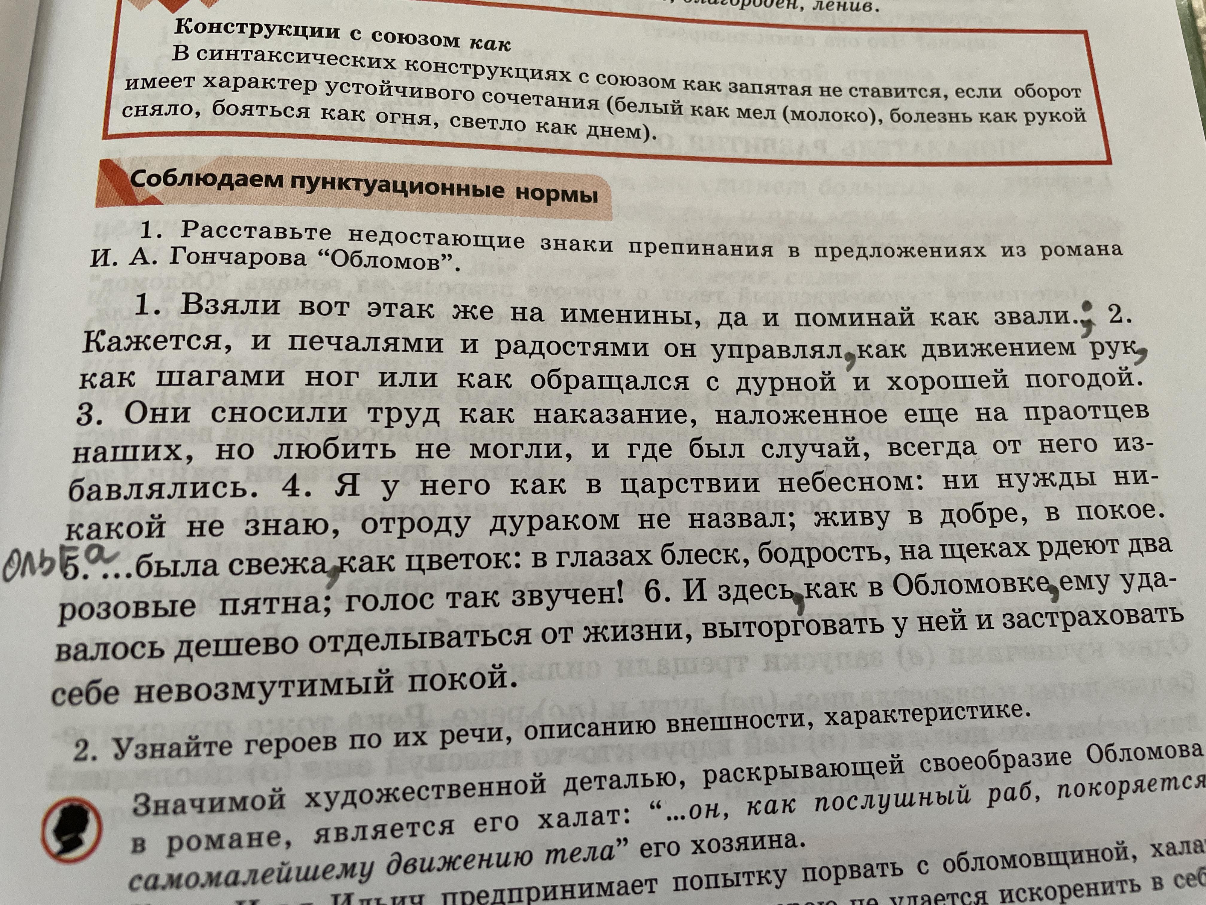1. Расставьте недостающие знаки препинания в предложениях из романа И. А. Гончарова “Обломов”. 1. Взяли вот этак же на именины, да и поминай как звали... 2. Кажется, и печалями и радостями он управлял как движением рук как шагами ног или как обращался с дурной и хорошей погодой. 3. Они сносили труд как наказание, наложенное еще на праотцев наших, но любить не могли, и где был случай, всегда от него из- бавлялись. 4. Я у него как в царствии небесном: ни нужды ни- какой не знаю, отроду дураком не назвал; живу в добре, в покое. 5. ...была свежа как цветок: в глазах блеск, бодрость, на щеках рдеют два розовые пятна; голос так звучен! 6. И здесь как в Обломовке ему уда- валось дешево отделываться от жизни, выторговать у ней и застраховать себе невозмутимый покой.
