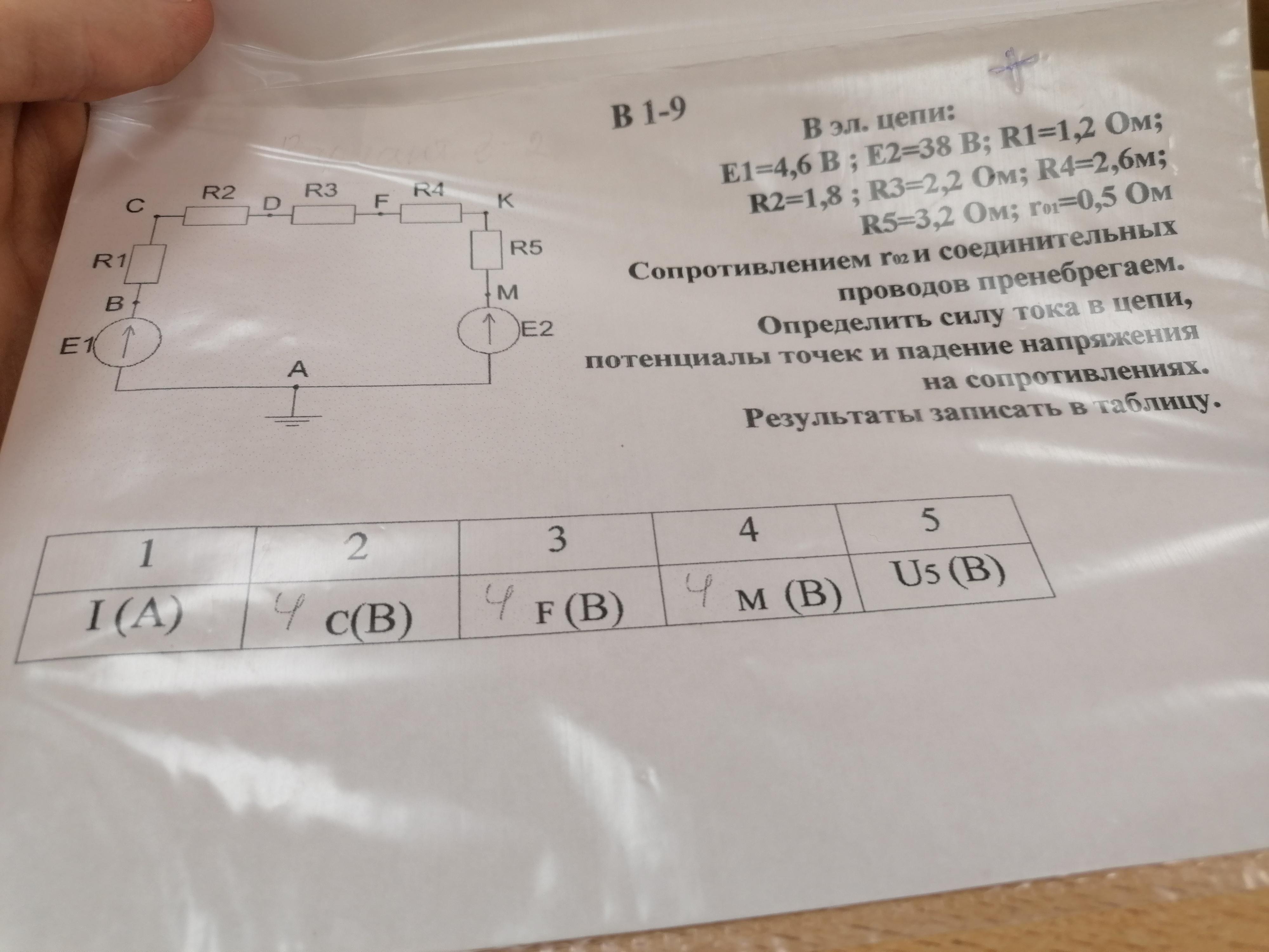 Срочно помогите B эл цепи E1=4.6B e2=38 r1=1.2Om r2=1.8 r3=2.2Om R4=2.6m R5=3.2Om r01=0.5Om Сопротивлением r02 и соеденительных проводов пренебрегаем. Определить силу тока в цепи, потенциалы точек и падение напряжения на Сопротивлениях. Результаты записать в таблицу