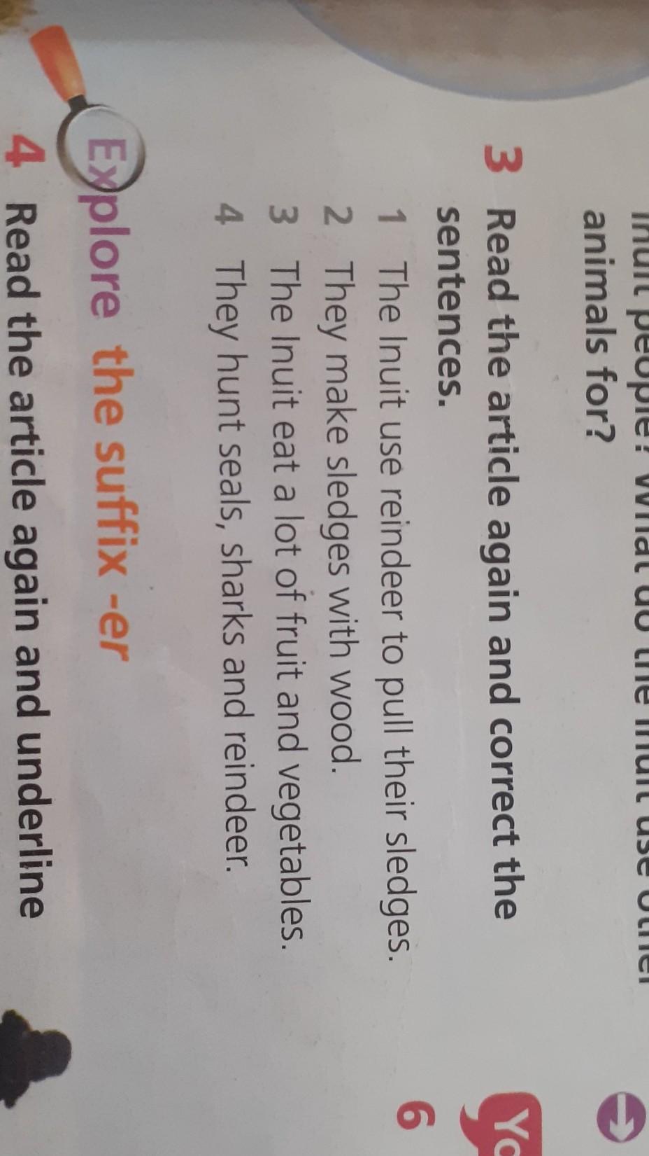1. The Inuit use teams of huskies to pull their sledges 2. They make sledges with animal bones and skin. 3. The Inuit eat a lot of meat and fish. 4. They hunt seals, polar bears and reindeer.