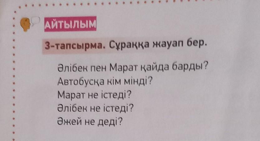 3-тапсырма. Сұраққа жауап бер. Әлібек пен Марат қайда барды? Автобусқа кім мінді? Марат не істеді? Әлібек не істеді? Әжей не деді? помогите пожалуйста казахский язык,заранее спасибо <3