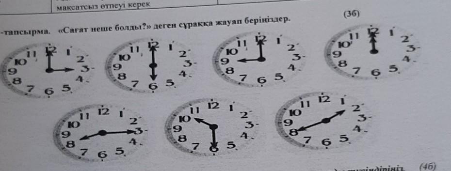 (36) 2-тапсырма. «Сағат неше болды?» деген сұраққа жауап беріңіздер. 2 :. 11 f' ю ю 9 2' 3- 2' 3 Ю 9 9 3 4 КО 2 9 3 8 7 6 5 8 А 4 8 8 7 6 5 7 6 5 7 6 5 12 i 2 12 1 1 Ю 2 2 3. lo 9 9 5 2 3- 8 4. 7 6 5 10 9 8 7 6 4 5. 7 6 5
