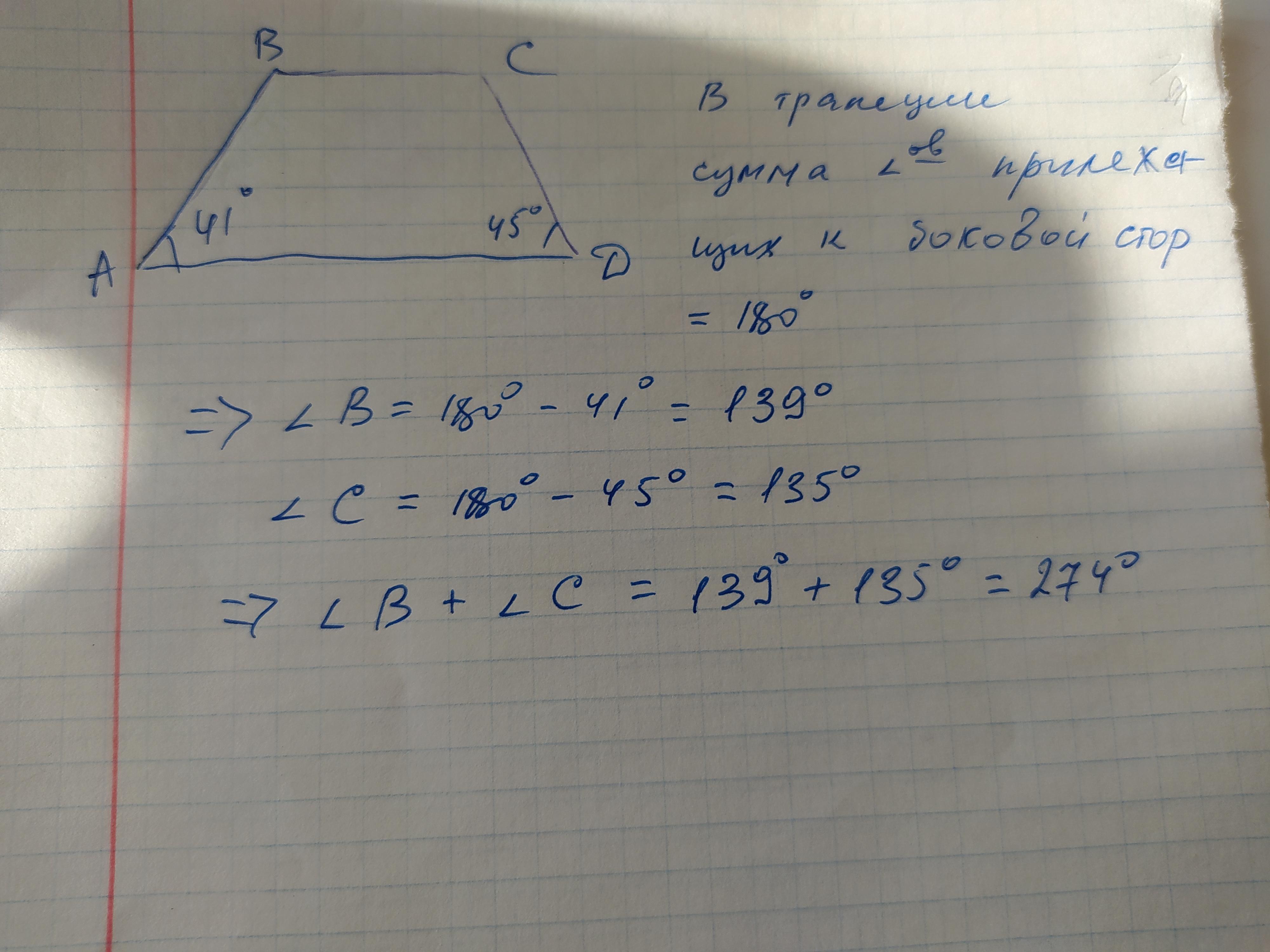 В трапеции сумма углов, прилежащий к боковой стороне, равна 180°. Следовательно: ∠В = 180° - ∠А = 180° - 41° = 139° ∠С = 180° - ∠D = 180° - 45° = 135° ∠В + ∠С = 139° + 135° = 274°