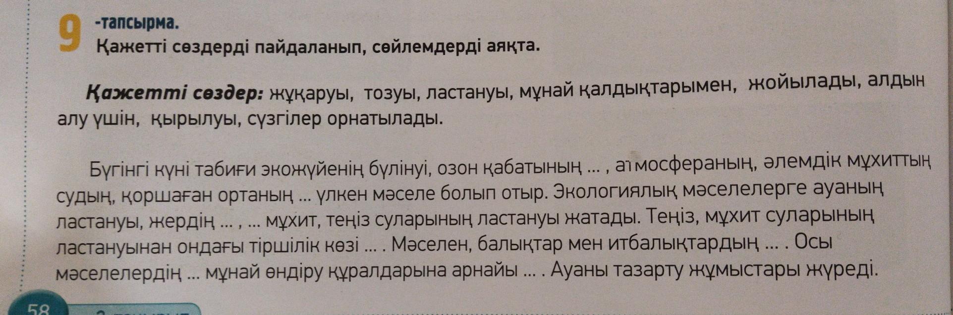 тапсырма 9 қажетті сөздерді пайдаланып, сөйлемдерді анқта, 131 қажетті сөздер: жұқаруы, тозуы, ластануы, мұнай қалдықтарымен, мойилади, his. алу үшін, қырылуы, сүзгілер орнатылады, Үлгі Бүгінгі күні табиғи экожүйенің бүлінуі, озон қабатының ... , атмосфераның, әлемдік ми ай, судың, қоршаған ортаның үлкен мәселе болып отыр. Экологиялық мәселелерге ауа Ан кој ластануы, жердің ... ... мұхит, теңіз суларының ластануы жатады. Теңіз, мұхит суларнинг де ластануынан ондағы тіршілік көзі ... . Мәселен, балықтар мен итбалықтардың ... Осы мәселелердің .. мұнай өндіру құралдарына арнайы .. . Ауаны тазарту жұмыстары жүреді,