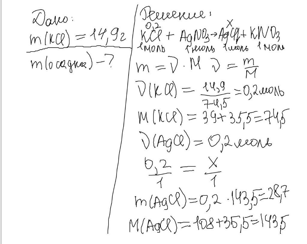 Реши задачу. Рассчитайте массу осадка, образовавшегося при взаимодействии 14,9г хлорида калия и 68г нитрата серебра .