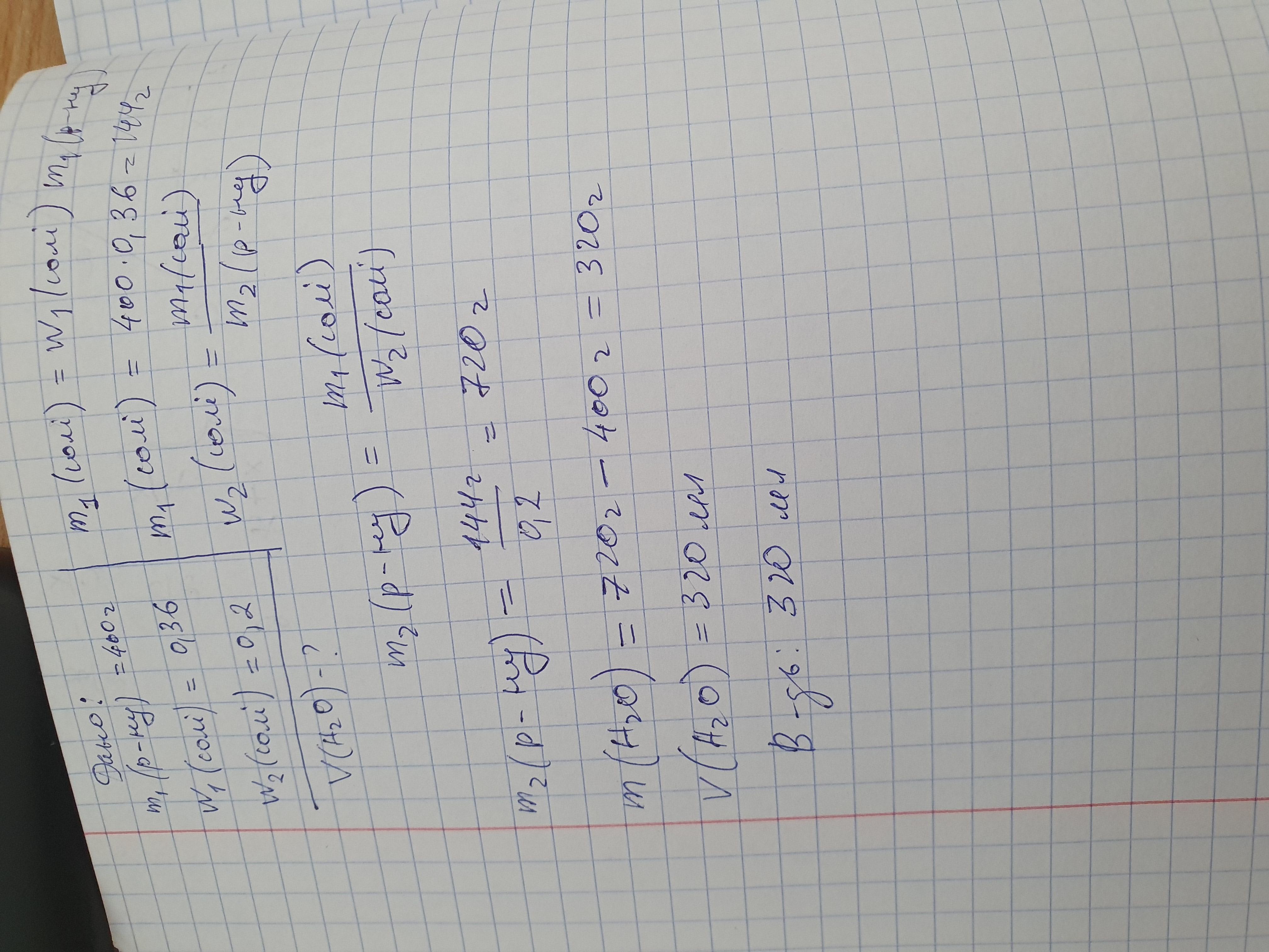 Який об'єм води необхідно додати до розчину солі масою 400 г з масовою часткою 36 %, щоб отримати розчин цієї ж солі з масовою часткою розчиненої речовини 20 %?