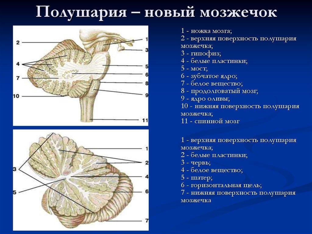 Мозжечо́к (лат. cerebellum — дословно «малый мозг») — отдел головного мозга позвоночных, отвечающий за координацию движений, регуляцию равновесия и мышечного тонуса. У человека располагается позади продолговатого мозга и варолиева моста, под затылочными долями полушарий головного мозга. Посредством трёх пар ножек мозжечок получает информацию из коры головного мозга, базальных ганглиев, экстрапирамидной системы, ствола головного мозга и спинного мозга. Функции: