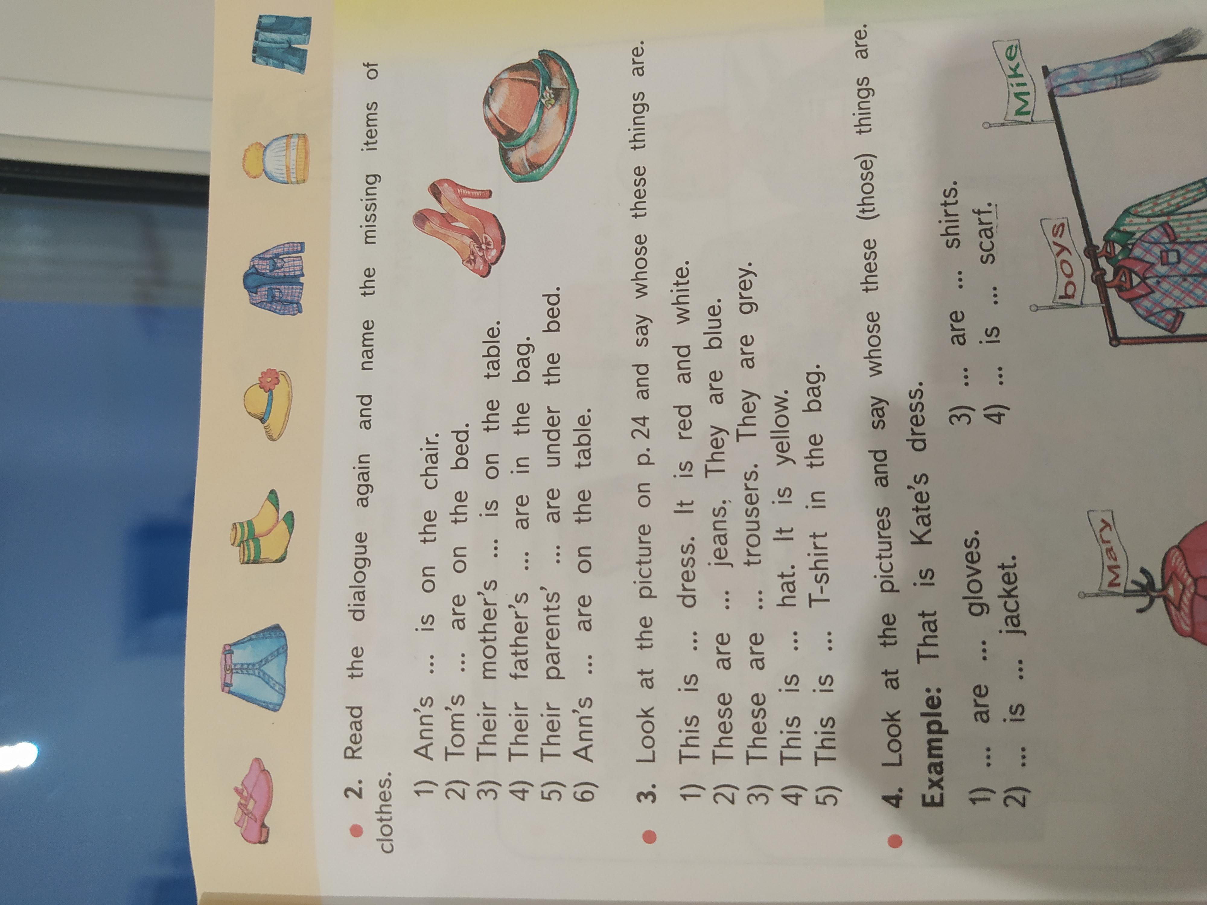 Read the dialogue again and name the missing items of clothes. 1) Ann`s ... is on the chair. 2) Tom`s ... are on the bed. 3) Their mother`s ... is on the table. 4) Their father`s ... are in the bag. 5) Their parents` ... are under the bed. 6) Ann`s ... are on the table.
