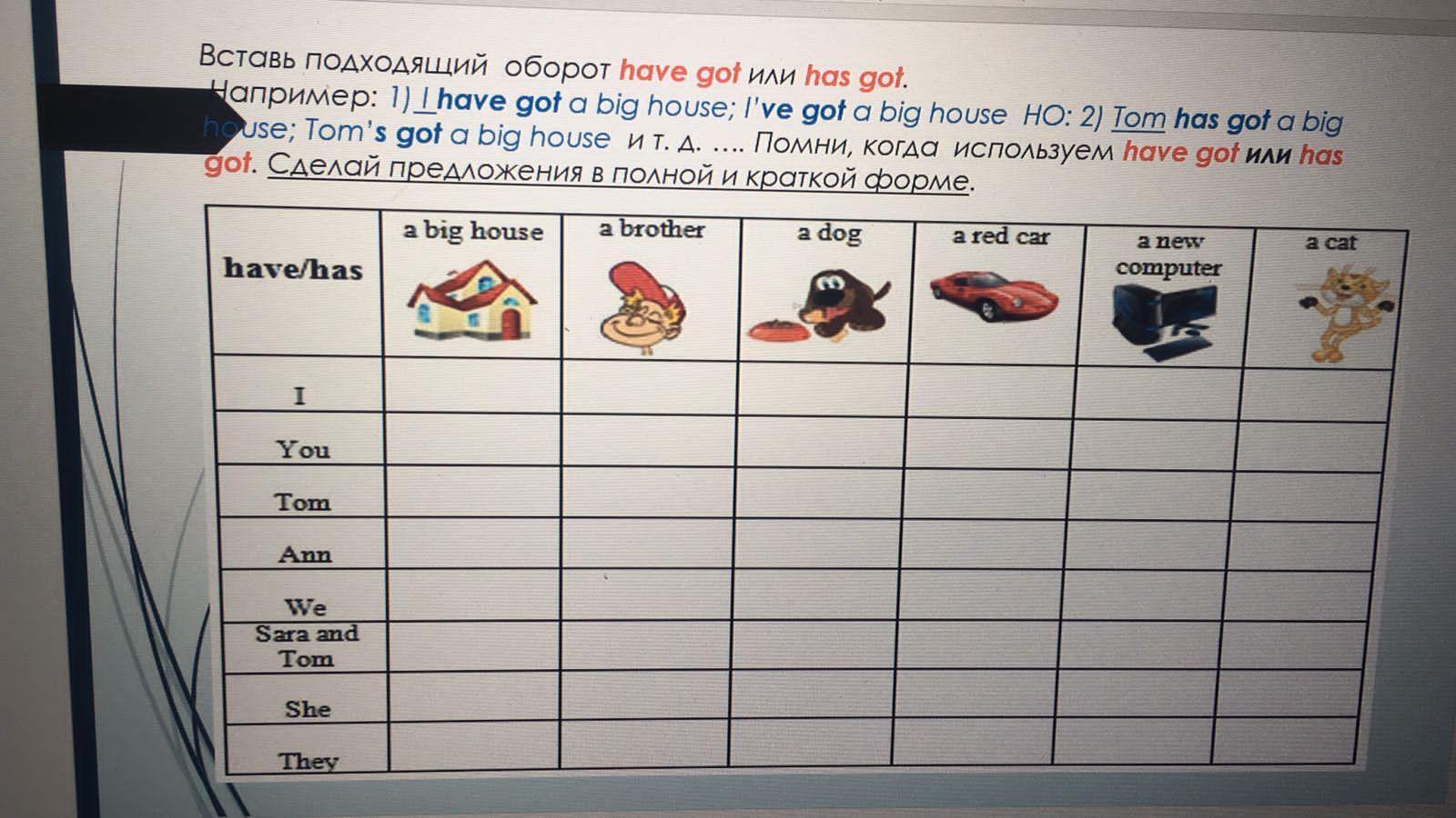Tom has got a big house. Tom’s got a brother. Tom has got a dog. Tom has got a red car. Tom’s got a new computer. Tom has got a cat.