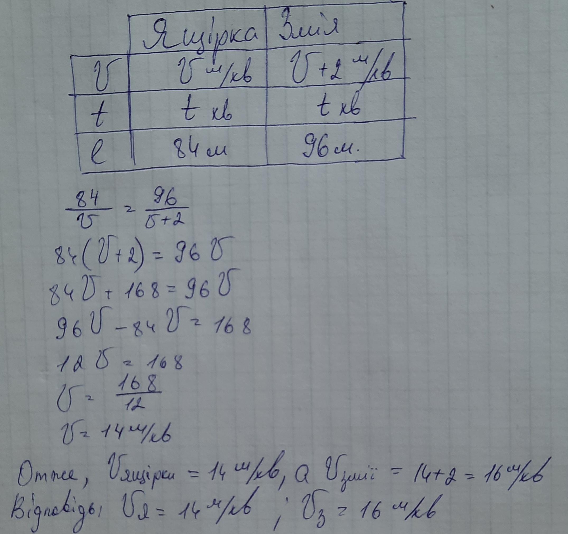 Ящірка проповзає 84 м, а змія — 96 м за той самий час, при цьому швидкість