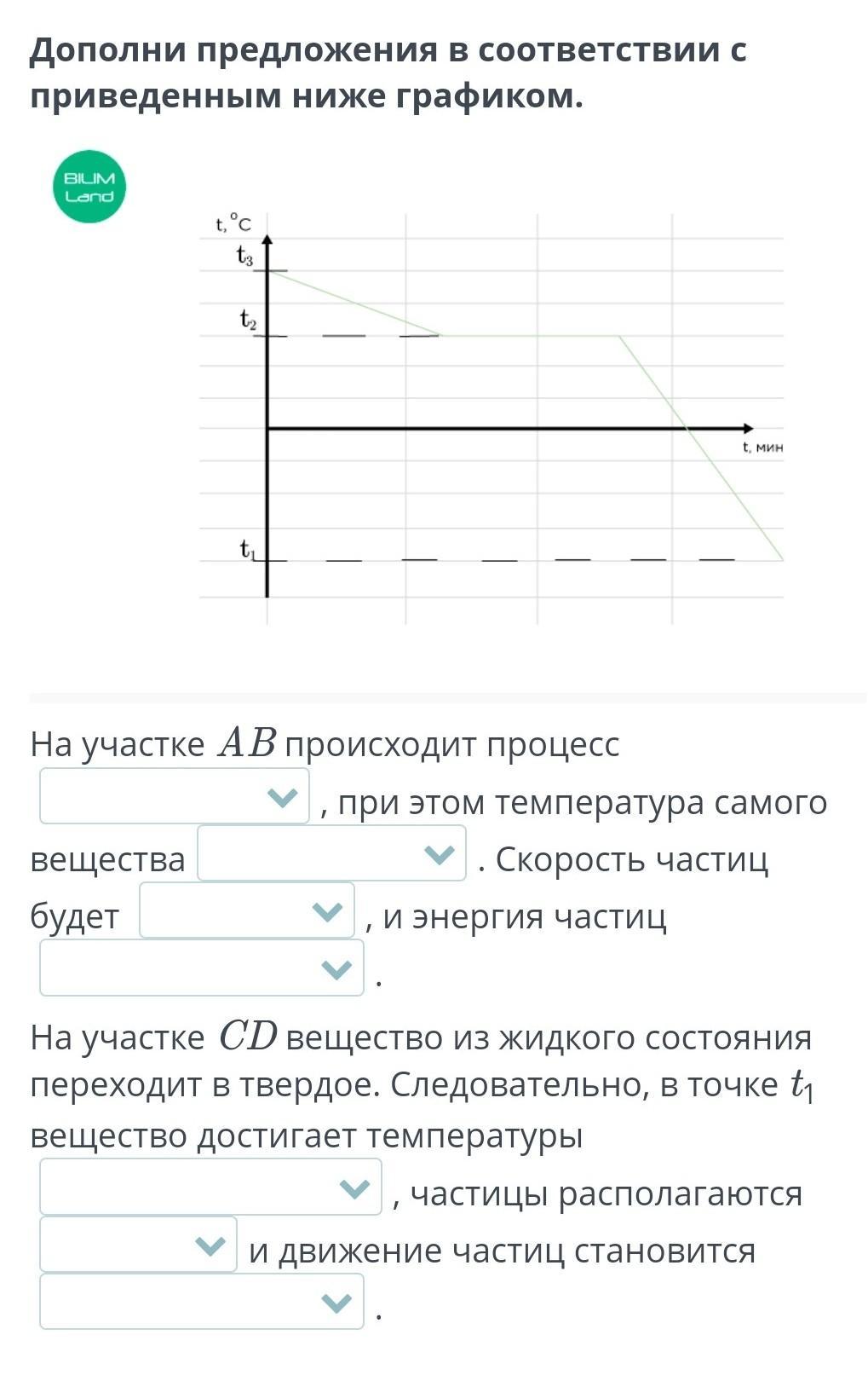 Дополни предложения в соответствии с приведенным ниже графиком. На участке AB происходит процесс , при этом температура самого вещества . Скорость частиц будет , и энергия частиц . На участке CD вещество из жидкого состояния переходит в твердое. Следовательно, в точке t1 вещество достигает температуры , частицы располагаются и движение частиц становится