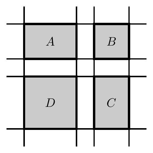 Петя провёл 4 горизонтальных прямых и 4 вертикальных и среди образовавшихся прямоугольников отметил четыре «угловых»: A, B, C и D (схематично это показано на рисунке справа). Периметры прямоугольников A, D, C равны 11 см, 17 см и 15 см соответственно. Найдите периметр прямоугольника B. (Стороны прямоугольников не обязательно целые.)(Объяснение обязательно)