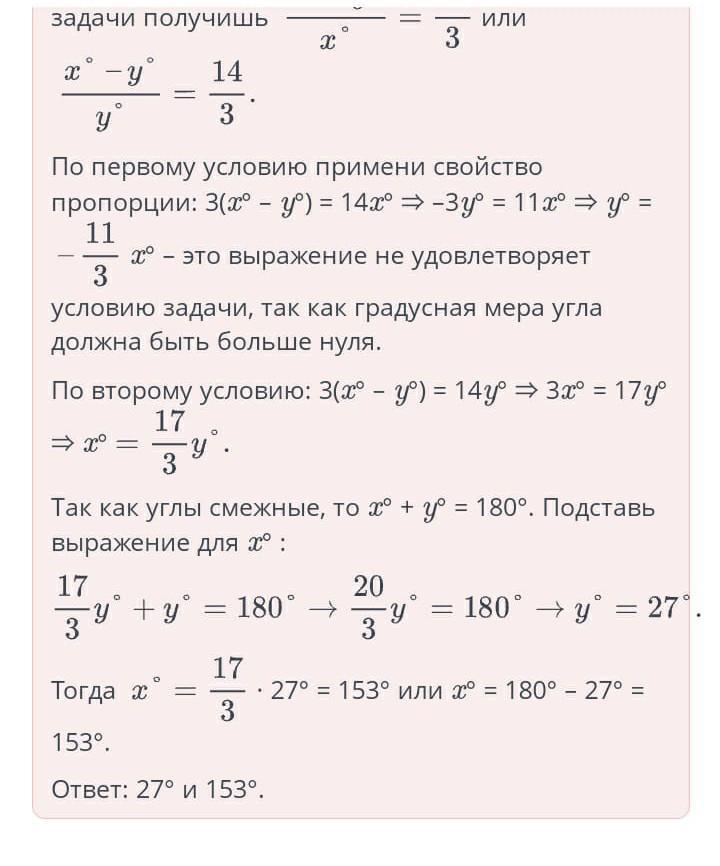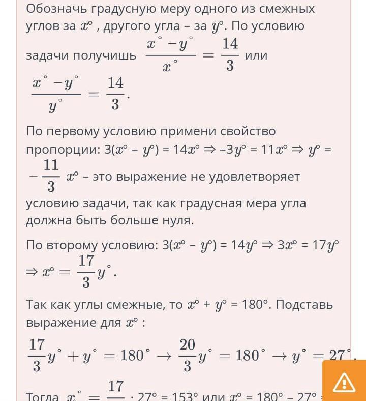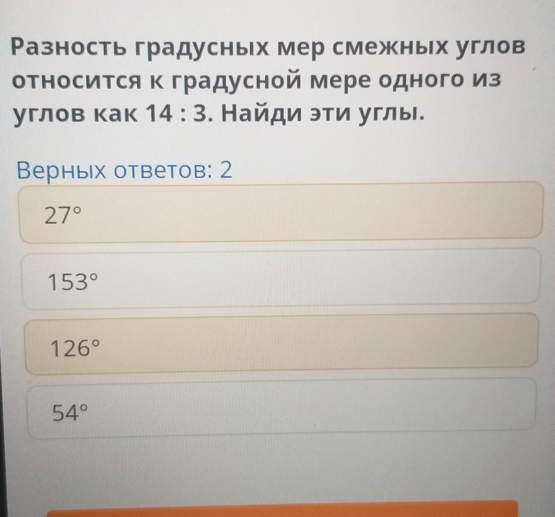 х Смежные и вертикальные углы, их свойства. Урок 5 Разность градусных мер смежных углов относится к градусной мере одного из углов как 14:3. Найди эти углы. Верных ответов: 2