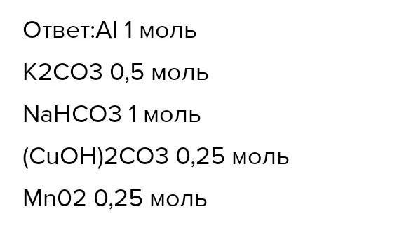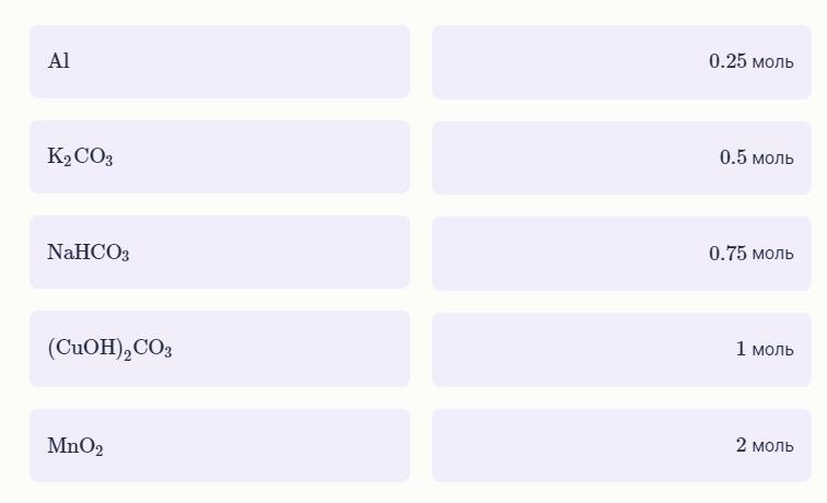 Ниже перечислены 5 веществ, которые реагируют с соляной кислотой с выделением газа. Каждому веществу поставьте в соответствие количество газа, который выделяется при взаимодействии стехиометрического количества данного вещества с раствором, содержащим 1 моль HCl.