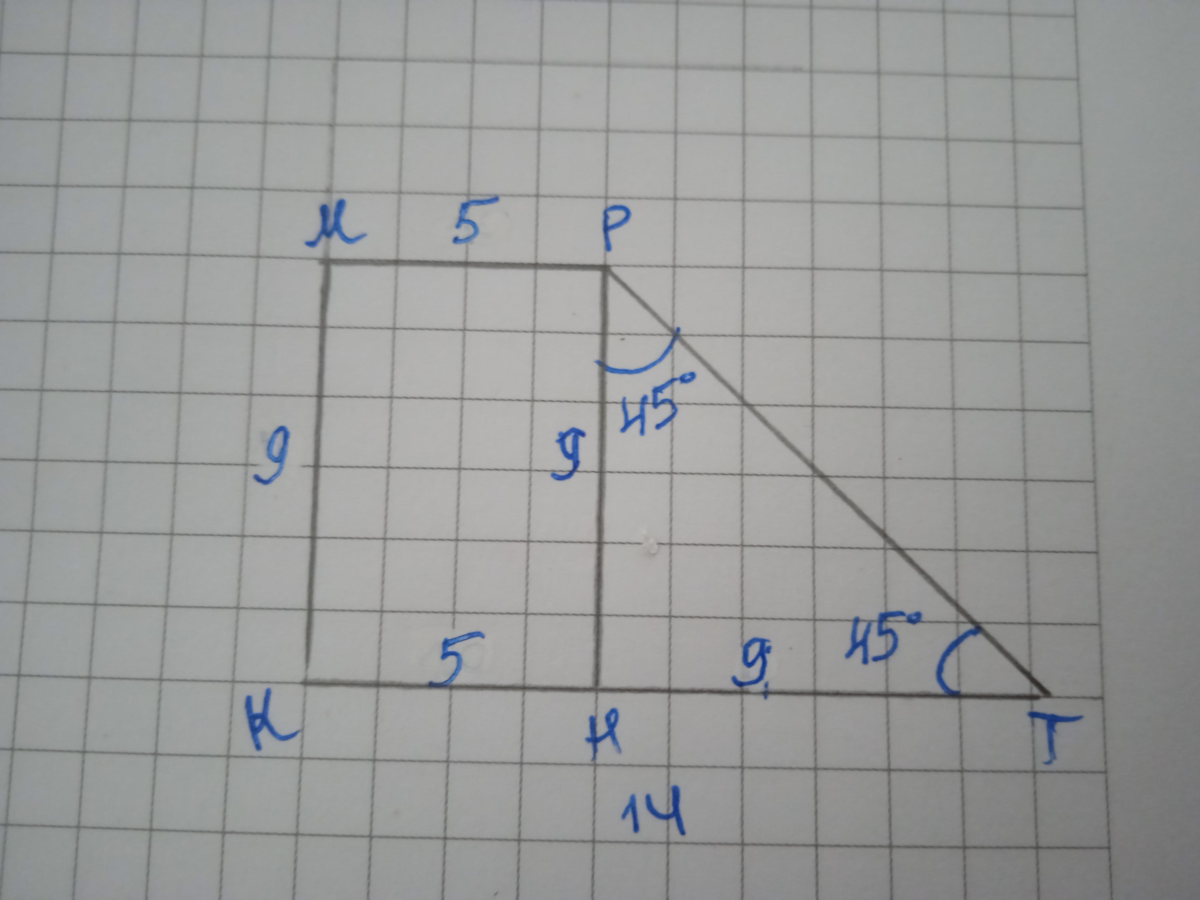 Дано: КМРТ - трапеция, КМ⊥КТ, ∠РТК=45°. МР=5 см, КТ=14 см. Найти КМ.