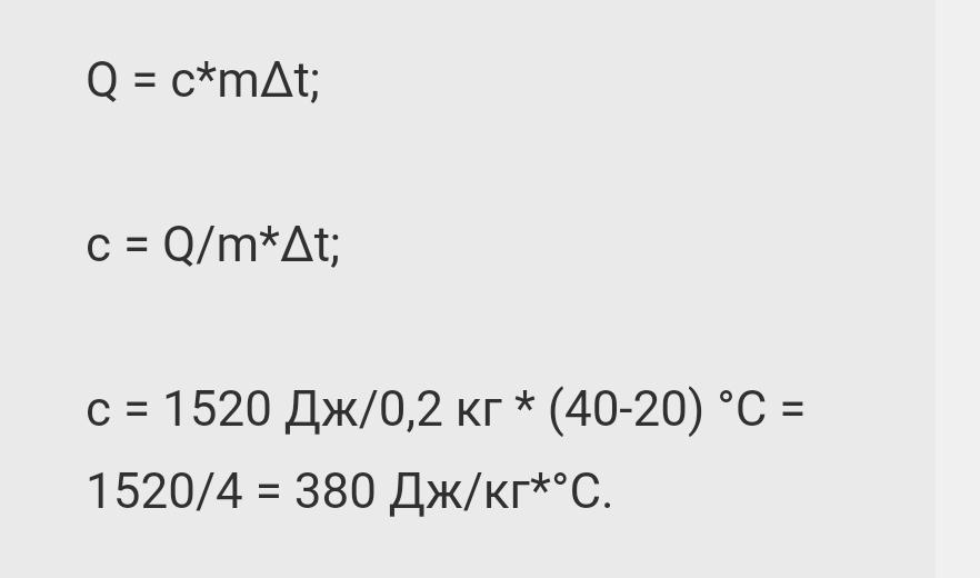 Для нагревания тела массой 200 г от температуры 200С до температуры 400С потребовалось 1,52 кДж теплоты. Определите удельную теплоемкость тела. [3]