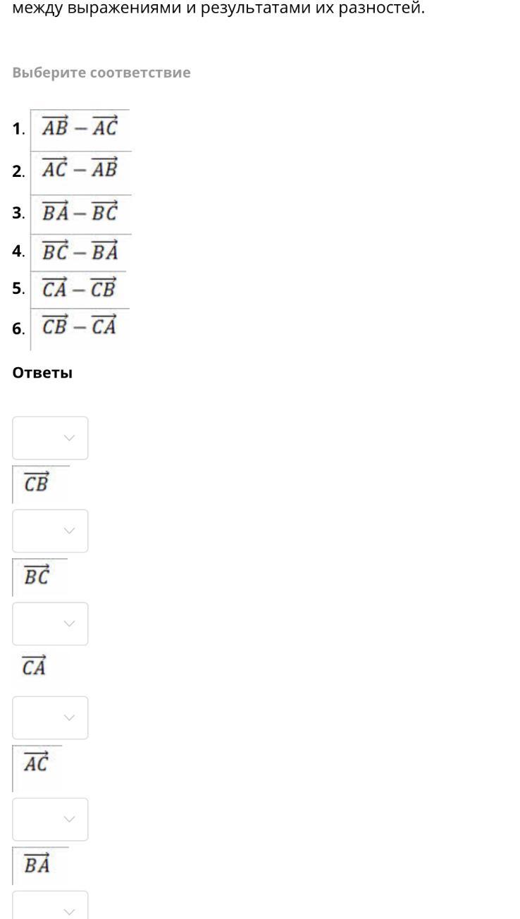 Для произвольных точек A, B и C установите соответствие между выражениями и результатами их разностей.