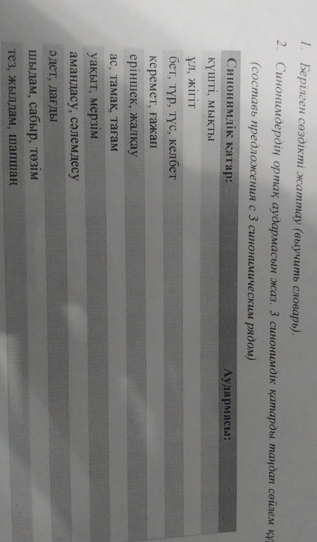 Уй жумысы. 1 Бергаген создiстi жаттау (выучить словарь) 2. Синонимдердін ортақ аудармасын жаз 3 синонимдік қатарды тандап сойлем құра (составь предложения с 3 синонимическим радом) Синонимдік катар: кушп, мыкты ул, жигт бет, тур, тус, келбет керемет, гажап срiншек, жалкау ас, тамак, тагам уакыт, мерзiм амандасу, сәлемдесу алет, дагды шыдам, сабыр, тезім тез, жылдам, шапшан Аудармас