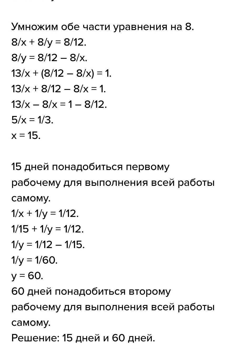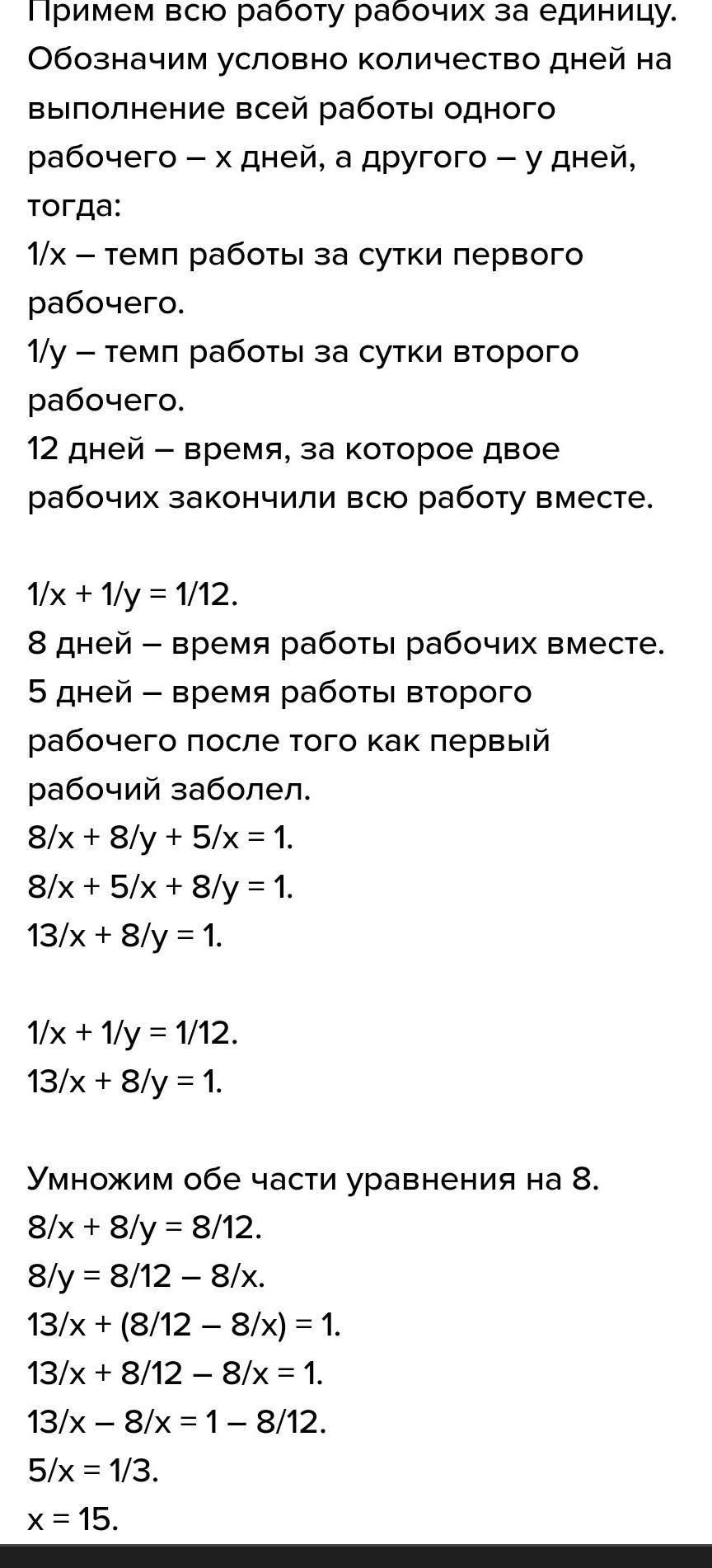 Двое рабочих могут выполнить некоторую работу за 12 дней. После 8 дней совместной работы первый рабочий перешел на другой участок. Второй рабочий закончил работу за 5 дней. За сколько дней каждый рабочий, работая отдельно, может выполнить данную работу?