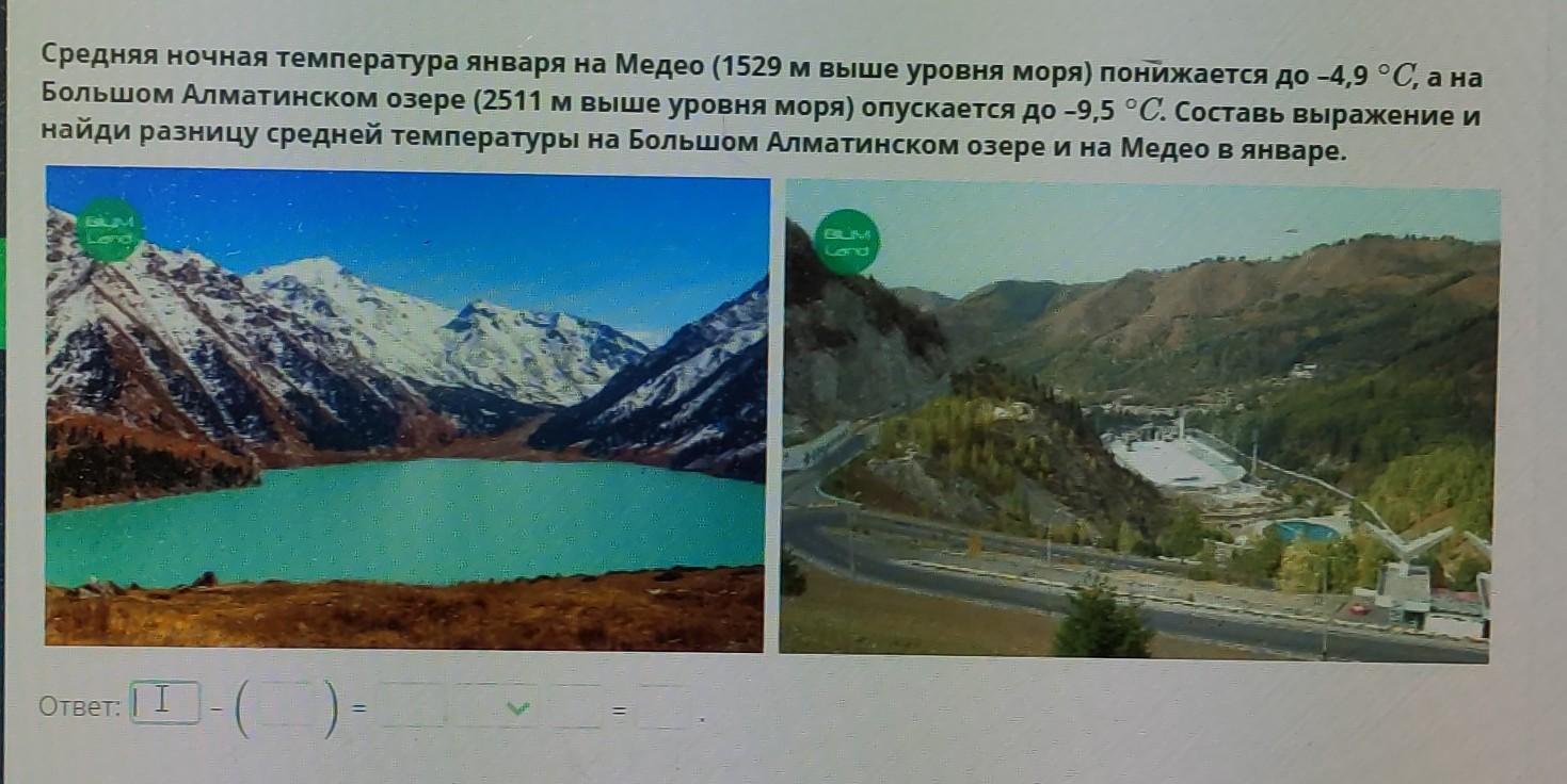 Средняя ночная температура января на Медео (1529 м выше уровня моря) понижается до -4,9 °C, а на Большом Алматинском озере (2511 м выше уровня моря) опускается до -9,5 °С. Составь выражение и найди разницу средней температуры на Большом Алматинском озере и на Медео в январе. Ответ: