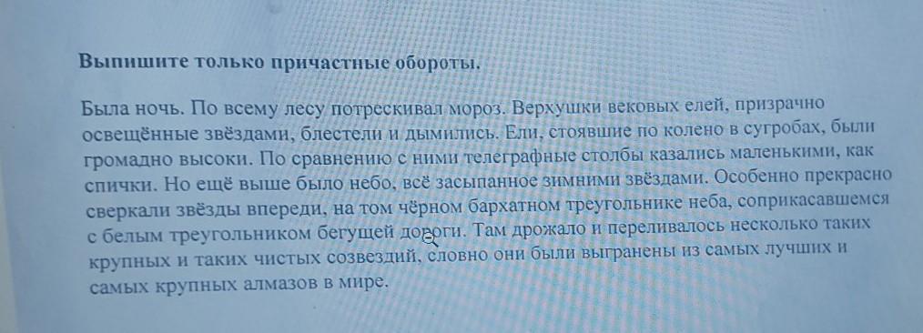 Призрачно освещенные звёздами; стоявшие по колено в сугробах; всё засыпанное зимними звёздами; соприкосавшемся с белым треугольником бегущей дороги;