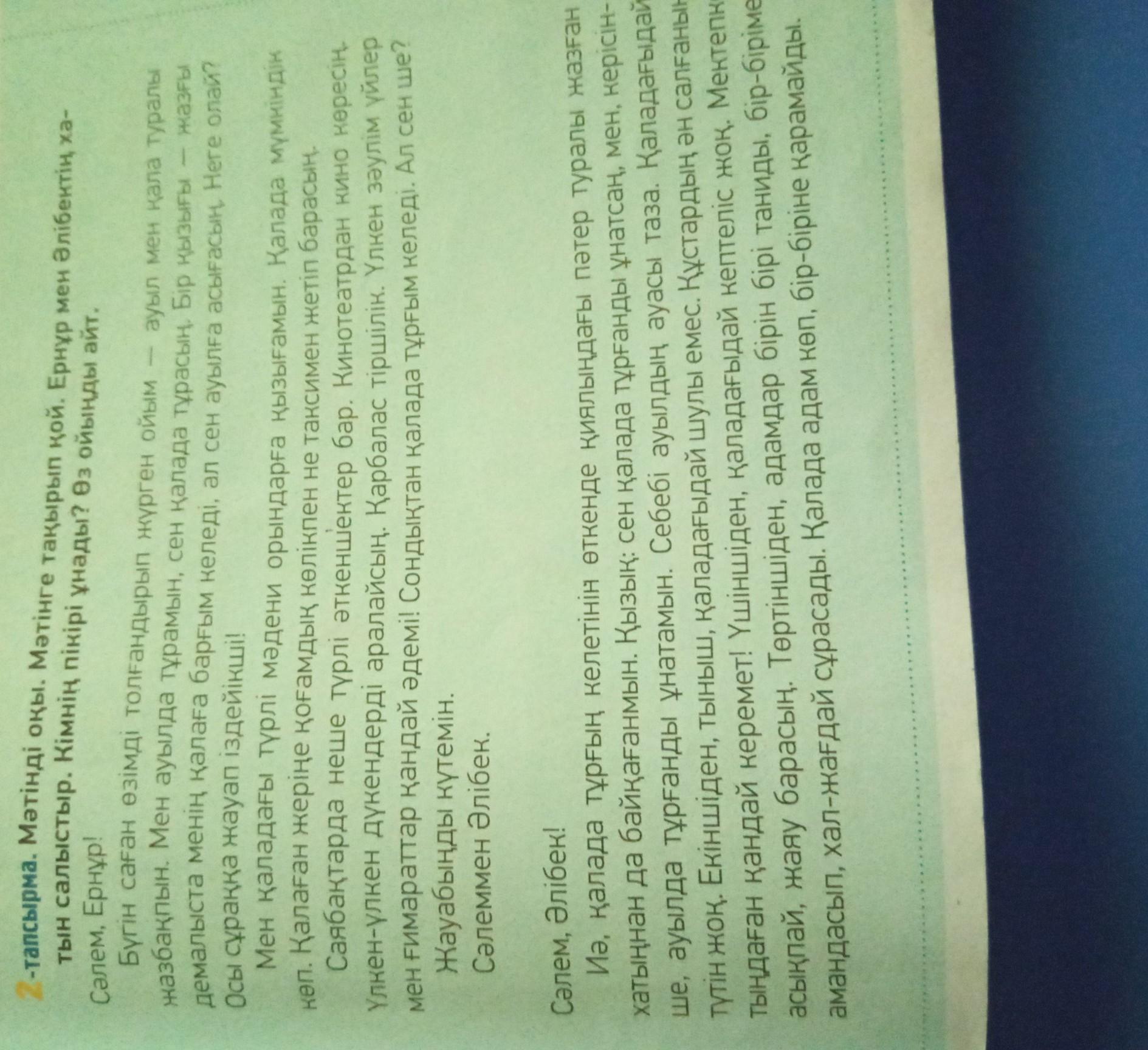 АЙТЫЛЫМ 5-тапсырма. Рөлдік ойын: Әнел мен Әлібектің атынан диалог құрыңдар. Талданатын тақырып: «Менің болашақ пәтерім». Сөйлесушілердің әрқайсысы өзі қалаған пәтердің артықшылығын, әсемдігін айтып, сөз таластыруы шарт. ПОМОГИТЕ СРОЧНО!!!