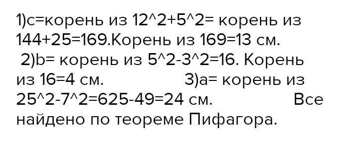 1.137. Найдите неизвестную сторону прямоугольн ого треугольника, если с - гипотенуза, а и b - катеты: 1) а = 12 см, b = 5 см; 2) а = 3 м, с = 5 м; 3) b = 7 м, с = 25 м.