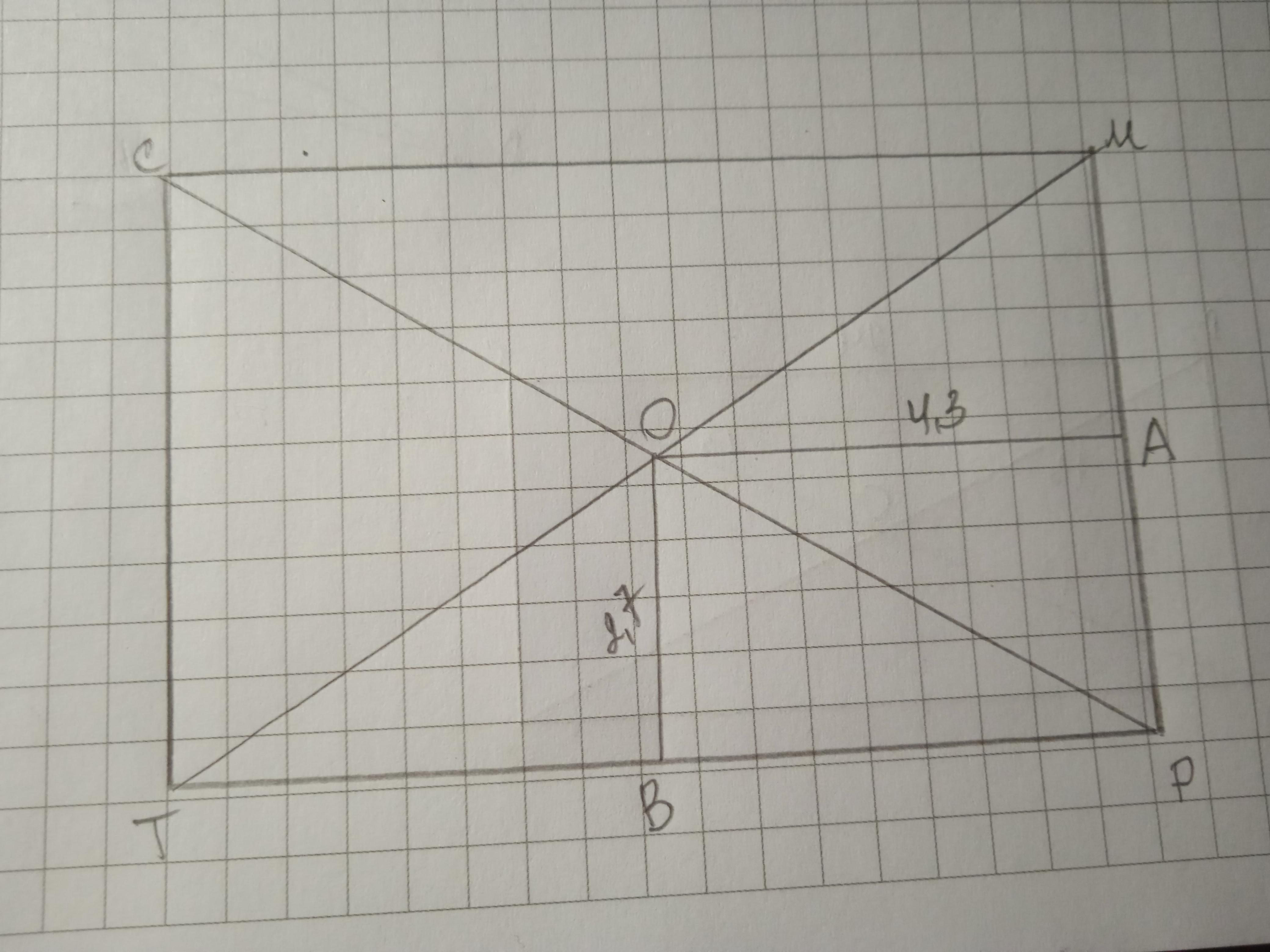Дано: СМРТ - прямокутник, СР, ТМ - діагоналі, АО=4,3 см, ВО=2,7 см. Знайти Р.