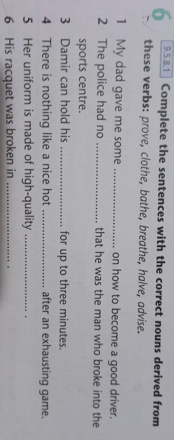 95,81] Complete the sentences with the correct nouns derived from these verbs: prove, clothe, bathe, breathe, halve, advise. 1 My dad gave me some .... on how to become a good driver. 2 The police had no that he was the man who broke into the sports centre. 3 Damir can hold his ........ for up to three minutes. 4 There is nothing like a nice hot after an exhausting game. 5 Her uniform is made of high-quality 6 His racquet was broken in