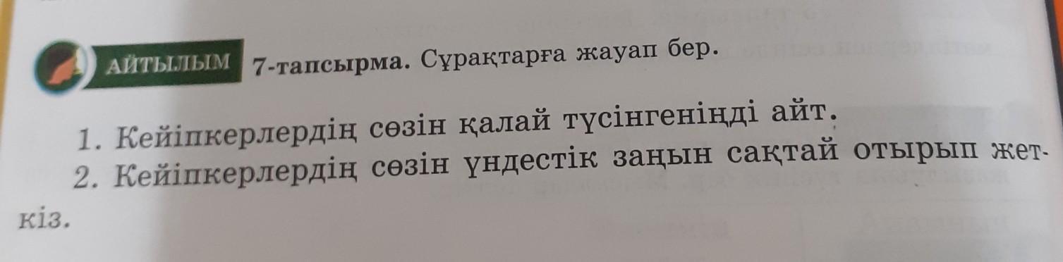 Айтылым 7-тапсырма. Сұрақтарға жауап бер. 1. Кейіпкерлердің сөзін қалай түсінгеніңді айт. 2. Кейіпкерлердің сөзін үндестік заңын сақтай отырып жет кіз.