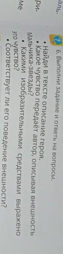 6. Выполни задание и ответы на вопросы, Найди в тексте описание героя, - Какое чувство передает автор, описывая внешность Какими изобразительными средствами виражено Мальчика-звезды? ме это чувство? . Соответствует ли его поведение внешности?