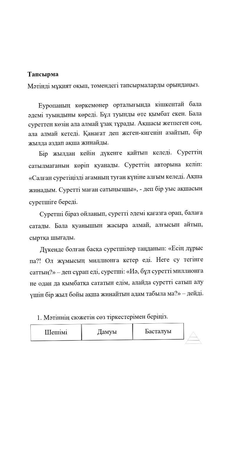 1.Мәтіннің сюжетін сөз тіркестерімен беріңіз