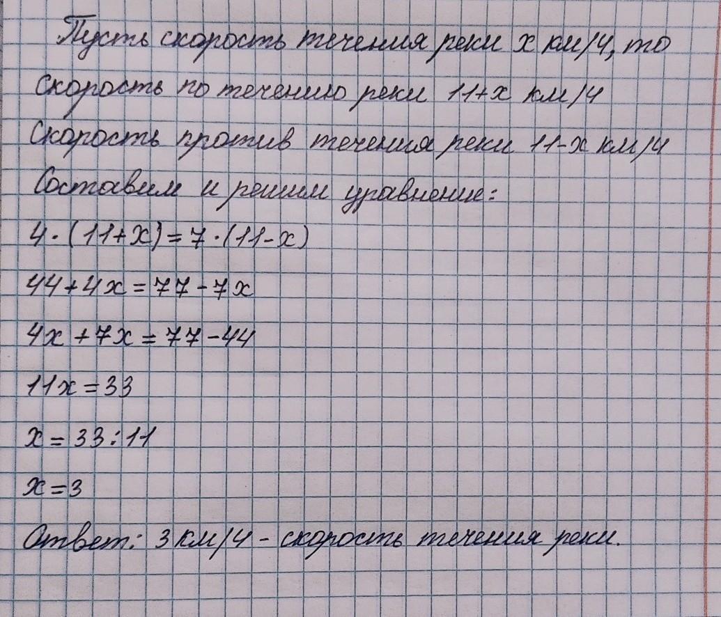 За 4 ч по течению реки пароход проходит тот же путь,Что за 7 часов против течения. Какова скорость течения реки если собственная скорость парохода 11 км/ч ?