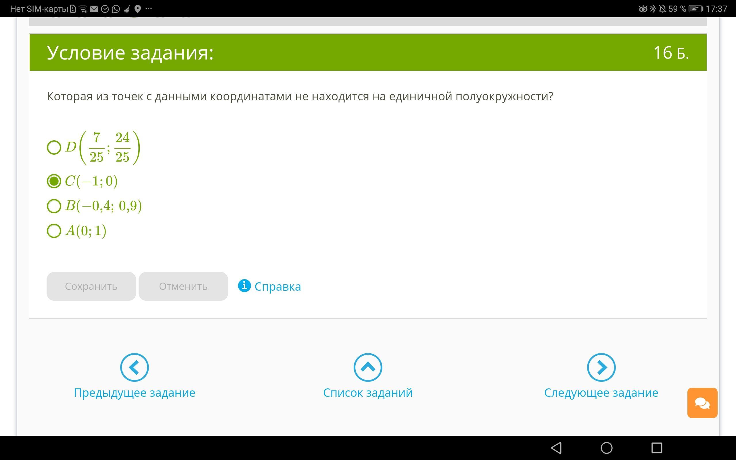 Которая из точек с данными координатами не находится на единичной полуокружности?