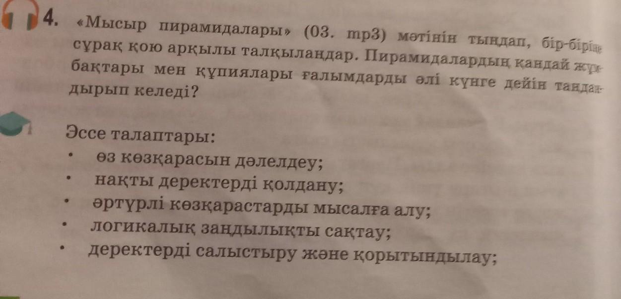 келесі осы деректер,осы деректердің шындық екенін дәлелдеисіз және адамдардың ойын жазасыздар, мысалы:кейбір адамдар пирамиданы нло мистикалық аламдар соғады деп ойлайды , ал кейбір адамдар пирамиданы алып адамдар соғады деп ойлайды , и соңғысы осының барлығын салыстырып дұрыс жауапты қортындап эссені жазып бітіресіздер. көмектесуге тырыстым , түсіндіңіздер деп ойлаймын!