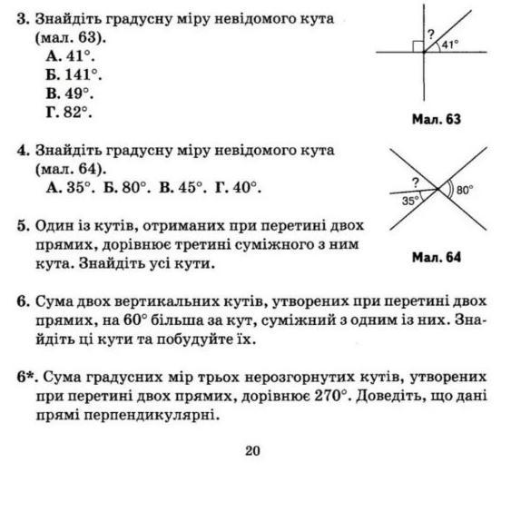 5. Один из углов, полученных при пересечении двух прямых, равна трети смежного с ним угла. Найдите все углы. 6. Сумма двух вертикальных углов, образованных при пересечении двух прямых, на 60 ° больше угол, смежный с одним из них. Зна идите эти углы и постройте их. 6 *. Сумма градусных мер трех неразвернутых углов, образованных при пересечении двух прямых, равна 270 °. Докажите, что данные прямые перпендикулярны.