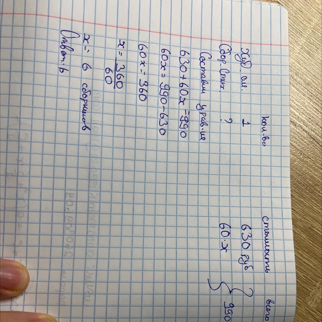 Помогите пожалуйста Наташа купила художественный альбом за 630 руб и несколько сборников стихов по 60 руб. каждый сколько сборников купила Наташа если за всю покупку она заплатила 990руб