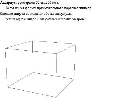 V = 35 * 50 * 74 = 129500 см³ = (129500 / 1000) л = 129,5 л