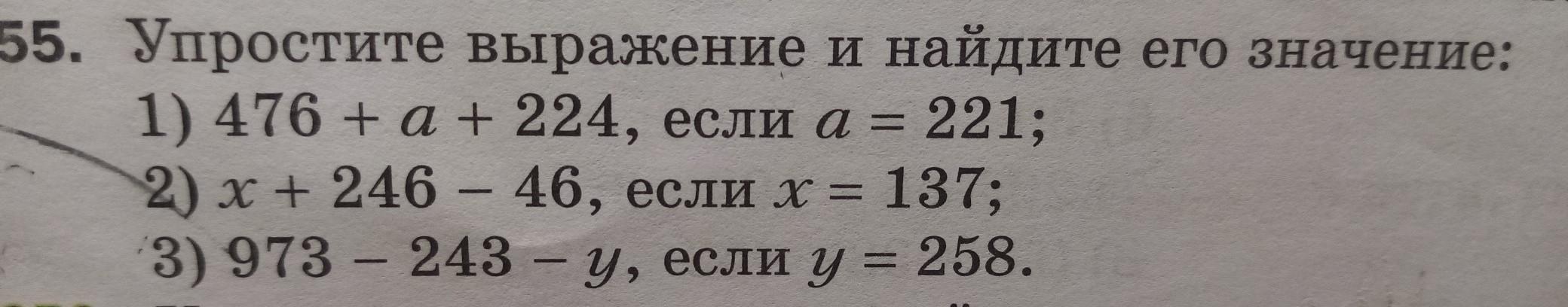 1) 476 +а+ 224, если а = 221; 2) х + 246 – 46, если х = 137; 3) 973 – 243 - у, если у = 258.