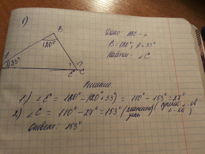 1)найдите внешний угол при третьей вершине треугольника, если два других угла равны 33 градуса и 120 градусов.