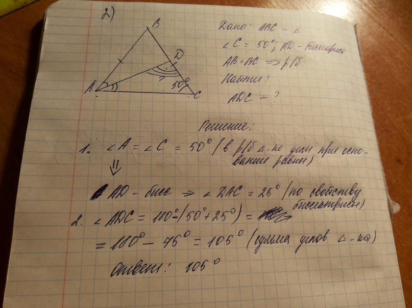 2)в равнобедренном треугольнике АВС с основанием АС проведена бессектриса АD.найдите угол АDС , если угол С равен 50 градусов.