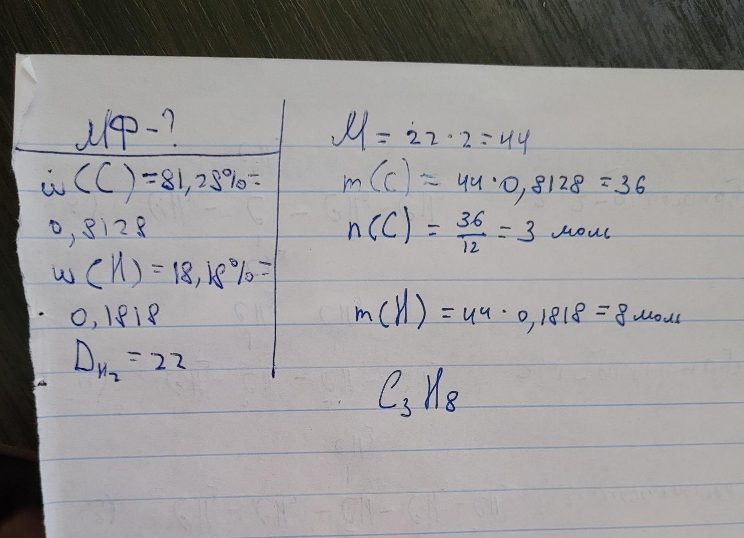 зобразити формулу насиченого вуглеводню якщо маса частки Карбону і Гідрогену дорівнюють 81,82% і 18,18% а густина пари за воднем 22