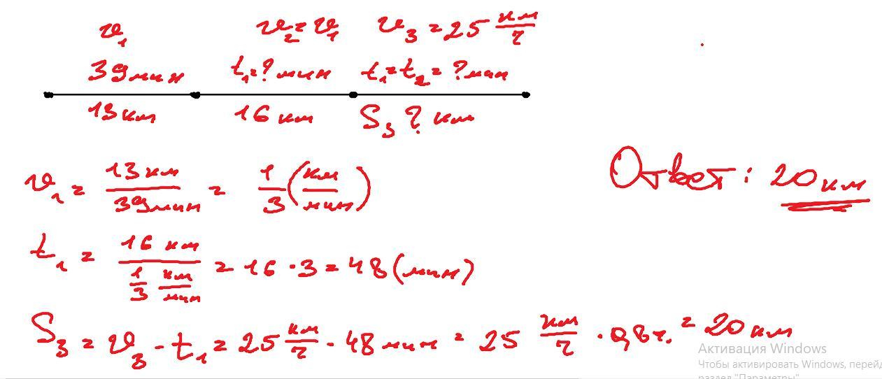 Первый участок пути равный 13 км велосипедист проехал за 39 минут. Второй участок пути равный 16000 м проехал с такой же скоростью, что и первый участок. Чему равна длина третьего участка, если велосипедист преодолел его за тоже время, что и второй участок, двигаясь при этом со скоростью 25 км/ч?
