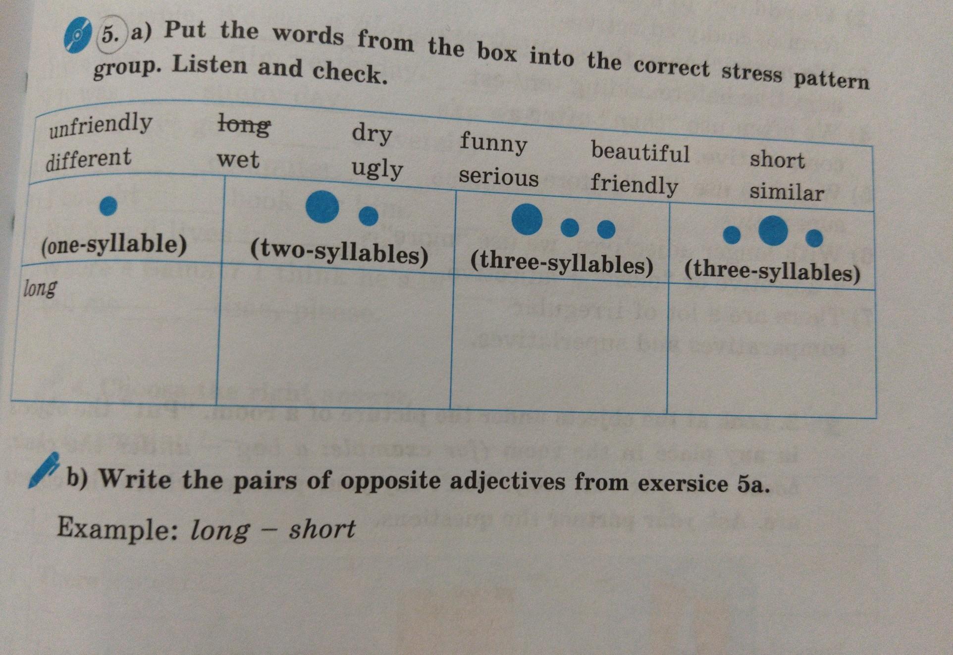 5. a) Put the words from the box into the correct stress pattern group. Listen and check. unfriendly different long wet dry ugly funny serious beautiful friendly short similar (two-syllables) (three-syllables) (three-syllables) (one-syllable) long